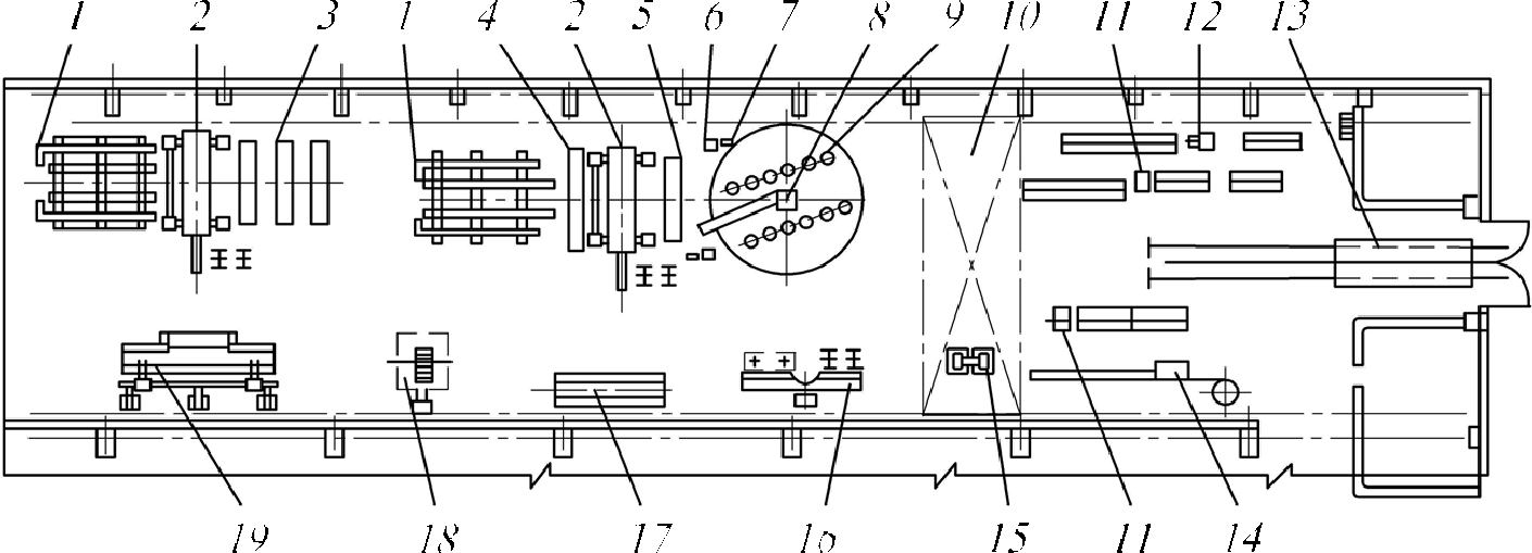 Рис. 2. Схема компоновки оборудования арматурного цеха завода ЖБИ: 1 — пакетировщик; 2 — многоточечная сварочная машина; 3 — стол; 4 — ножницы для поперечной резки сеток; 5 — прави´льное устройство; 6, 12 — стыкосварочная машина; 7 — электроточило для зачистки грата; 8 — консольный кран для установки мотков; 9 — бухтодержатели; 10 — мостовой кран; 11 — станок для резки прутков; 13 — самоходная тележка; 14 — прави´льно-отрезной станок; 15 — станок для гибки арматурных стержней; 16 — одноточечная сварочная машина; 17 — машина для гибки арматурных сеток; 18, 19 — соответственно горизонтальная и вертикальная установки для сборки арматурных каркасов