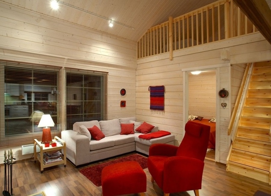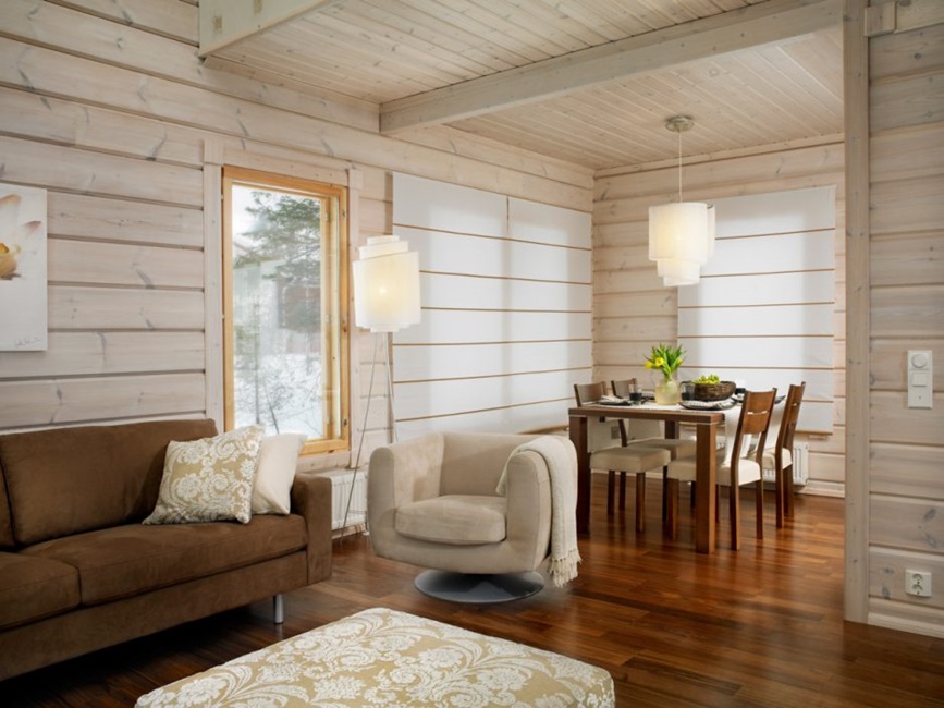 Внутренняя отделка имитацией бруса предполагает обшивку стен деревянными панелями. Различают два варианта отделки: