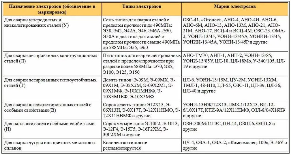 Таблица марок стержней и сферы использования для ручной дуговой сварки и наплавки легированной стали