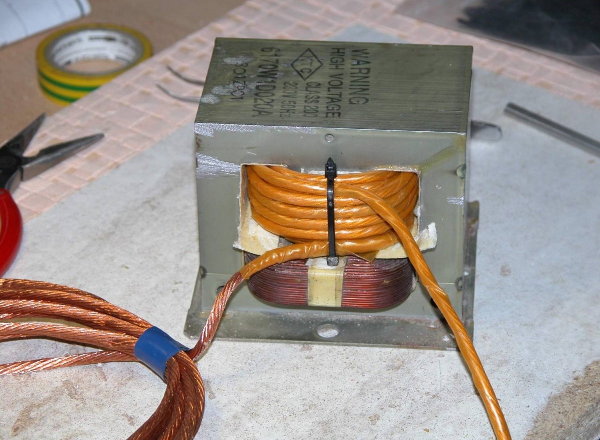 Всем этим требованиям вполне удовлетворяют трансформаторные устройства, имеющиеся в составе большинства моделей микроволновых печей. Для их использования достаточно удалить встроенную вторичную обмотку и заменить её новой.
