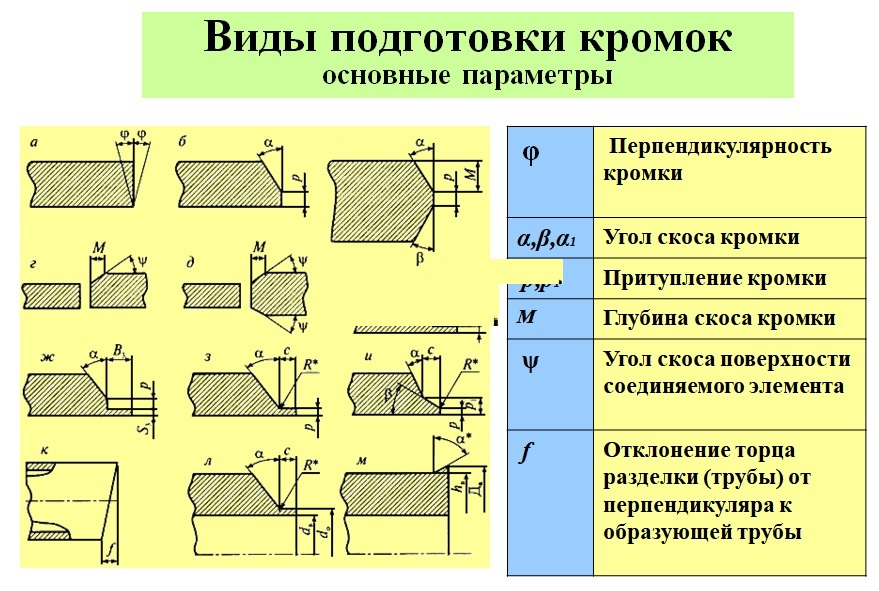 Для создания прочного и качественного сварного шва кромки соединяемых изделий проходят необходимую подготовку и им придается определенная форма (V, X, U, I, K, J, Y – образная). Во избежание прожога подготовку кромок можно выполнять при толщине металла не менее 3 мм.