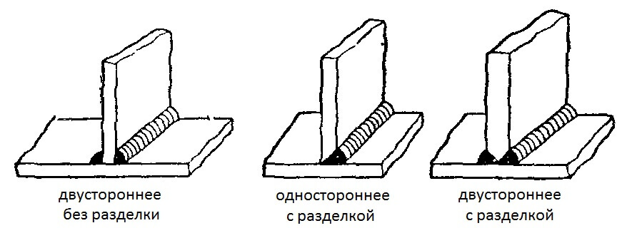 Эти разновидности электросварочных соединений выполняются как обычная буква «Т». Они соединяют предметы одинаковой или же различной толщины, от чего зависит ширина сварочного шва. Кроме того, данные типы используются одно- или двусторонними, на что влияют особенности скрепления. При работе с металлическими элементами различной толщины электрод удерживается в наклоненном положении под углом порядка 60 градусов. Процесс сварки можно значительно упростить, воспользовавшись прихватками, а также свариванием «в лодочку». Данный способ существенно снижает возникновение подрезов. Тавровый шов накладывается за один сварочный проход. Помимо ручной дуговой сварки, для данного типа широко используются автоматические электросварочные аппараты.
