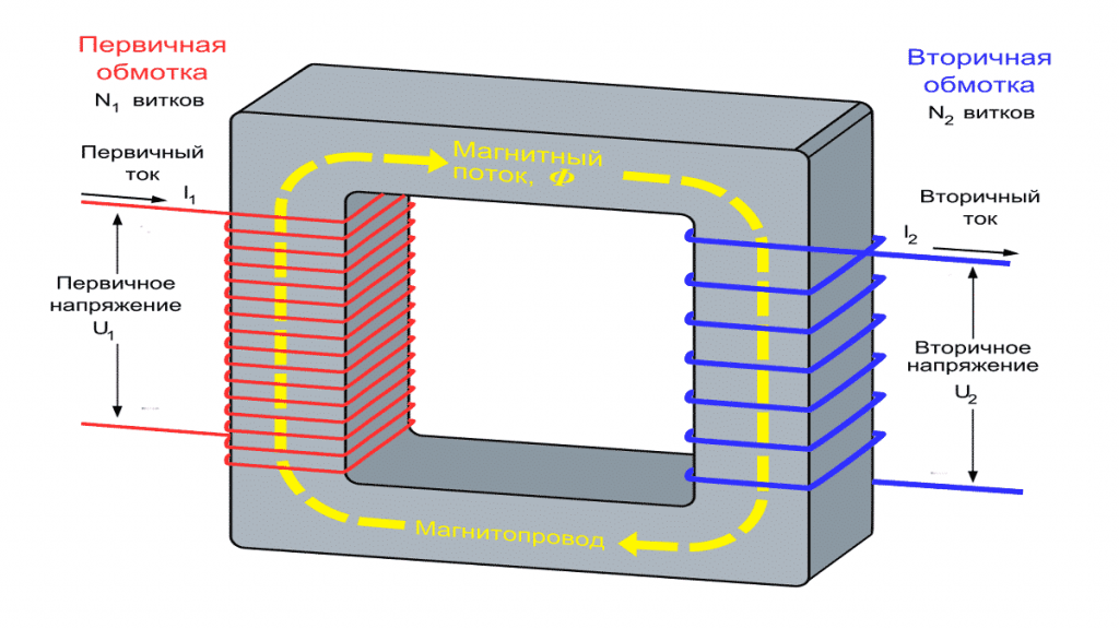 Когда на выводы первичных обмоток поступает синусоидальный ток, то он во второй катушке создает переменное магнитное поле, пронизывающее магнитопровод. В свою очередь, изменение магнитного потока провоцирует наведение ЭДС в катушках. При этом величина напряжения ЭДС в обмотках находится в пропорциональной зависимости от количества витков и частоты тока. Отношение количества витков в цепи первичной обмотки к числу витков вторичной катушки называется коэффициентом трансформации: k = W1 / W2, где символами W1 и W2обозначено количество витков в катушках.