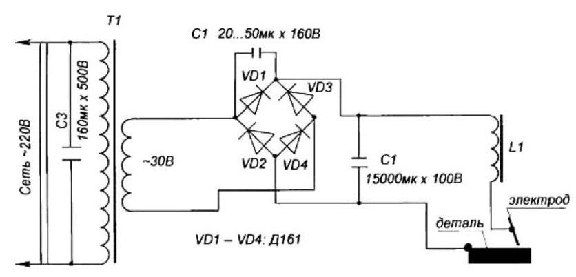 Основная часть устройства — выпрямительный мост из силовых мощных диодов. Они подключаются согласно схеме с обязательным учётом полярности.