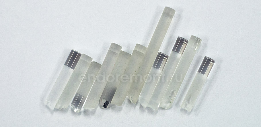 Эти поломки возглавляют наш ТОП не случайно, они являются самыми частыми среди поломок жестких эндоскопов при поступлении в сервисный центр. При внешнем отсутствии видимых повреждений, изображение может отсутствует полностью или частично. Также на корпусе могут быть видны различные вмятины или изгибы, которые говорят о причинах повреждения внутри жесткого эндоскопа. Только после вскрытия прибора можно обнаружить битые оптические линзы, так как данные компоненты, находясь внутри прибора, невооруженным глазом не видны. Без разборки эндоскопа можно понять, что линзы разбиты, но точное количество повреждений не определить. Данная поломка возникает вследствие механического повреждения и неаккуратного обращения. На фотографии ниже представлены разбитые стержневые линзы, извлеченные из жестких эндоскопов при ремонте.