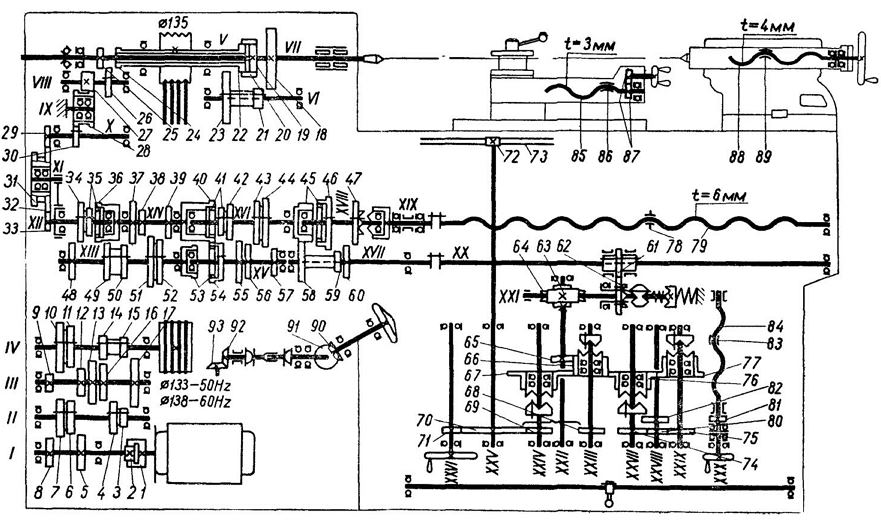 От шпинделя движение передается на гитару, и от нее на входной вал коробки подач.