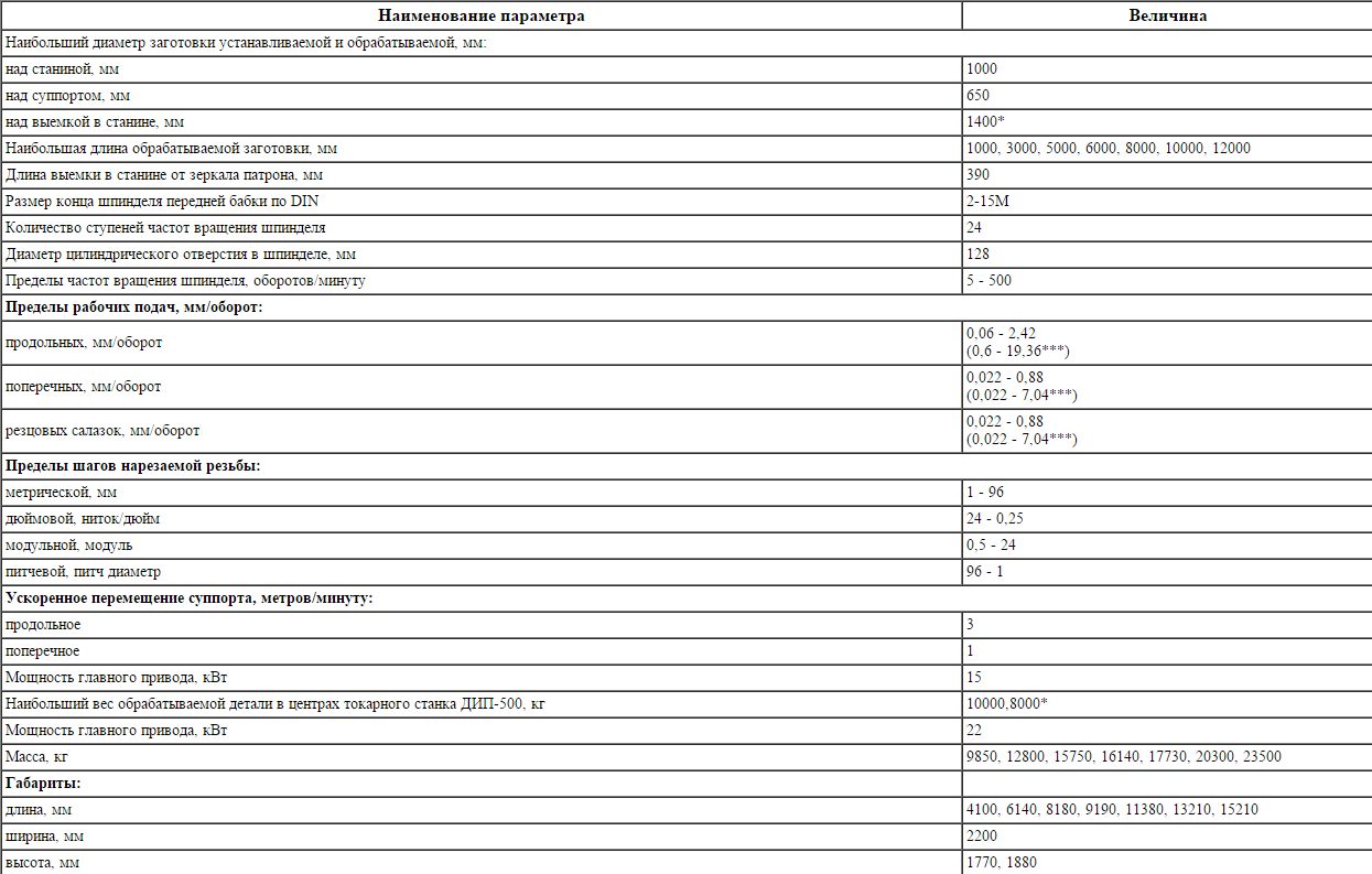 | Масса станка ДИП-500, кг | 9850, 12800, 15750, 16140, 17730, 20300, 23500 |