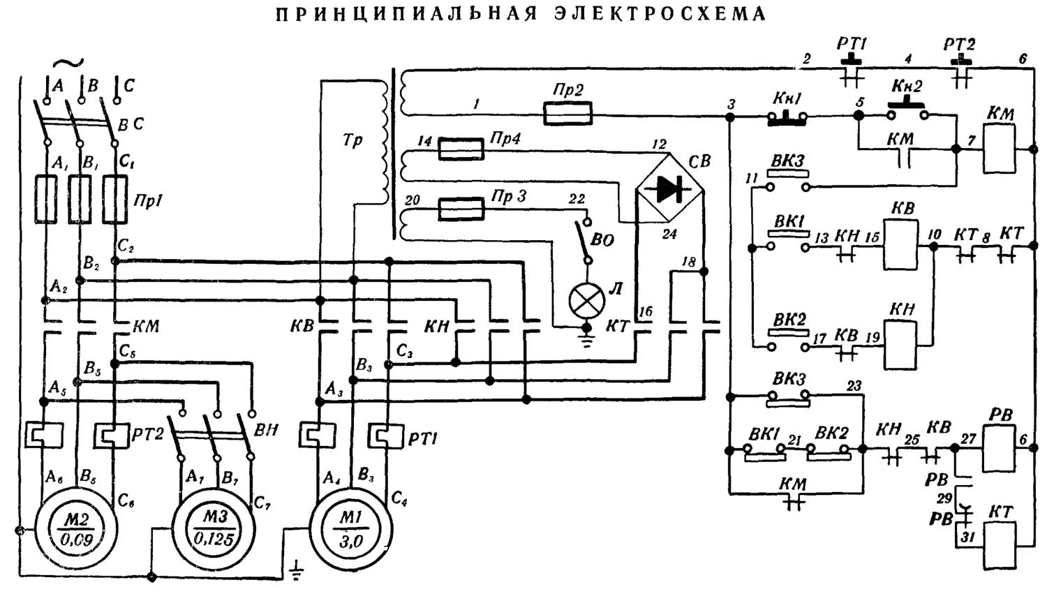 Главными элементами в электрической схеме агрегата являются три электродвигателя, отвечающие за главное движение, смазку узлов оборудования и подачу охлаждающей жидкости.