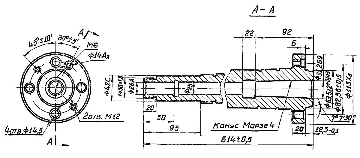 Шпиндель – полый вал с коническим отверстием. Жестко закреплен на подшипниках в передней бабке. Имеет внутренний конус Морзе для крепления инструмента (например: цанговых зажимов). Снаружи резьба для крепления планшайбы с патроном.