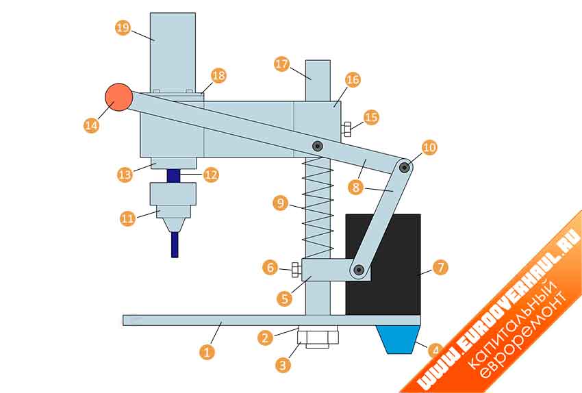 С пружинно-шарнирным механизмом: 1 — станина; 2 — шайба; 3 — гайка М16; 4 — амортизационные стойки 4 шт.; 5 — пластина; 6 — болт М6х16; 7 — блок питания; 8 — тяги; 9 — пружина; 10 — болт М8х20 с гайкой и шайбами; 11 — патрон для сверла; 12 — вал; 13 — крышка; 14 — ручка; 15 — болт М8х20; 16 — державка; 17 — стойка; 18 — стакан с подшипником; 19 — двигатель.