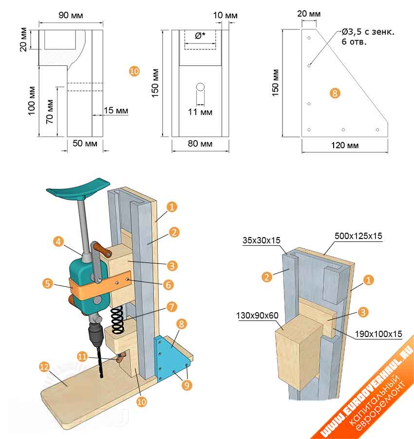 С пружинным механизмом: 1 — стойка; 2 — металлический или деревянный профиль; 3 — ползунок; 4 — ручная дрель; 5 — хомут крепления дрели; 6 — шурупы для крепления хомута; 7 — пружина; 8 — угольник для закрепления стойки 2 шт.; 9 — шурупы; 10 — упор для пружины; 11 — барашковый болт для крепления упора; 12 — основание станка.