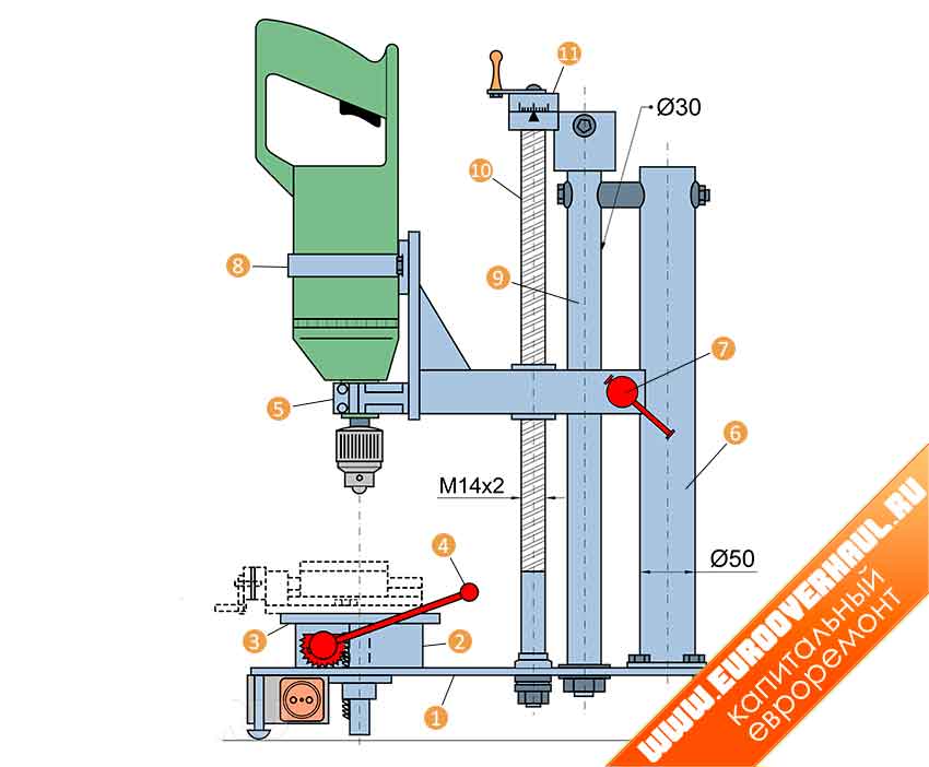 Сверлильно-фрезерный станок: 1 — основание станка; 2 — опоры подъёмной плиты стола 2 шт.; 3 — подъёмная плита; 4 — ручка подъёма стола; 5 — подвижный держатель дрели; 6 — дополнительная стойка; 7 — винт фиксации держателя дрели; 8 — хомут крепления дрели; 9 — основная стойка; 10 — ходовой винт; 11 — барабан со шкалой Нониуса.