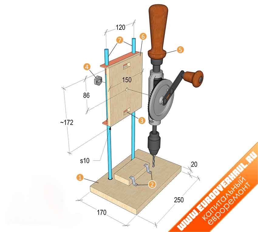 Станок из ручной дрели: 1 — станина; 2 — стальные прижимы; 3 — пазы для крепления дрели; 4 — гайка крепления дрели; 5 — дрель; 6 — ползун; 7 — трубки направляющие.
