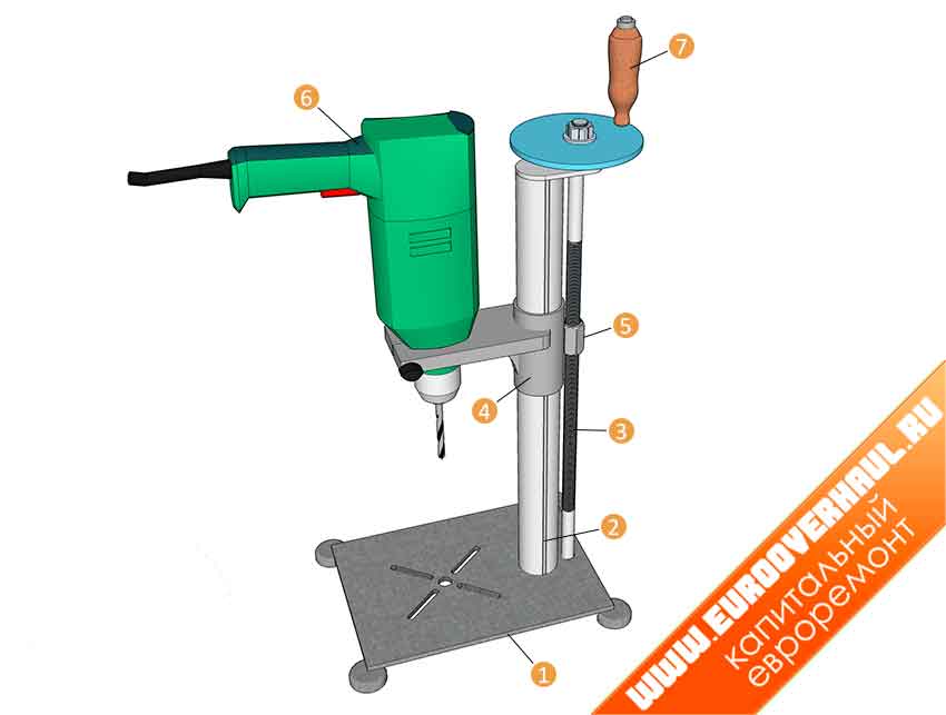 Стойка, работающая по принципу винтового домкрата: 1 — станина; 2 — направляющий паз; 3 — резьба М16; 4 — втулка; 5 — гайка, приваренная к втулке; 6 — дрель; 7 — ручка, при вращении которой происходит движение дрели вверх или вниз.
