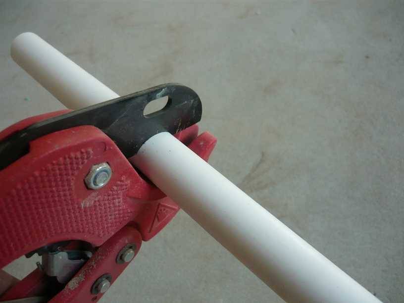 Труборез роликовый с храповым механизмом. Труба вкладывается в с-образную выемку и при смыкании рукоятей отсекается лезвием, расположенным напротив. Резка должна проводиться строго под углом в 90о. Отклонение в процессе резки приводит к деформации линии реза или даже к поломке ножниц.