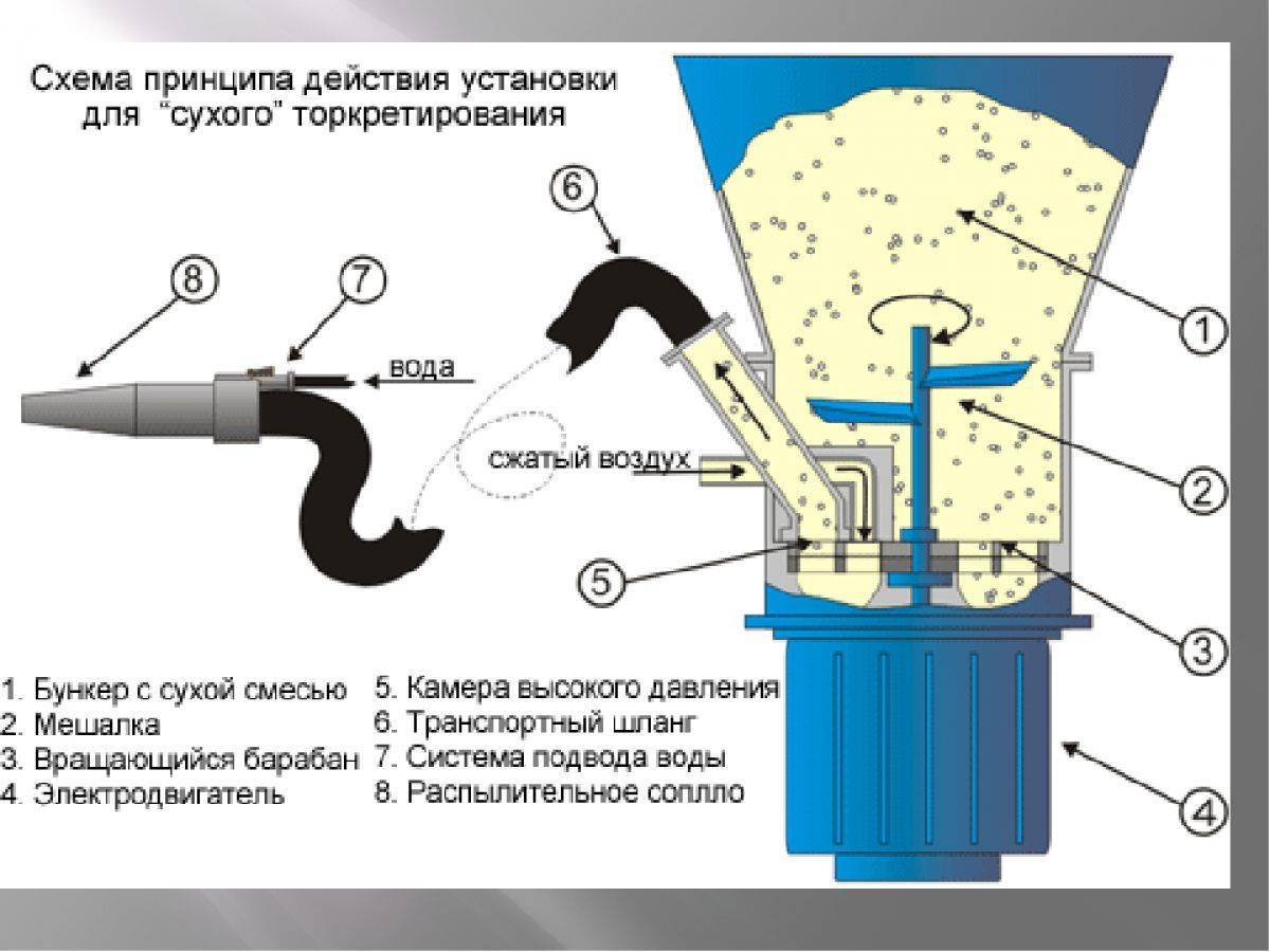 Для проведения работ все необходимые сухие материалы предварительно дозируются и смешиваются. Затем засыпаются в приемный бункер торкрет установки, откуда под высоким давлением воздушной массы подаются в сопло (распылитель). В основании распылителя сухая смесь соединяется с водой, и под действием давления воздуха выбрасывается на поверхность строящегося или ремонтируемого основания.