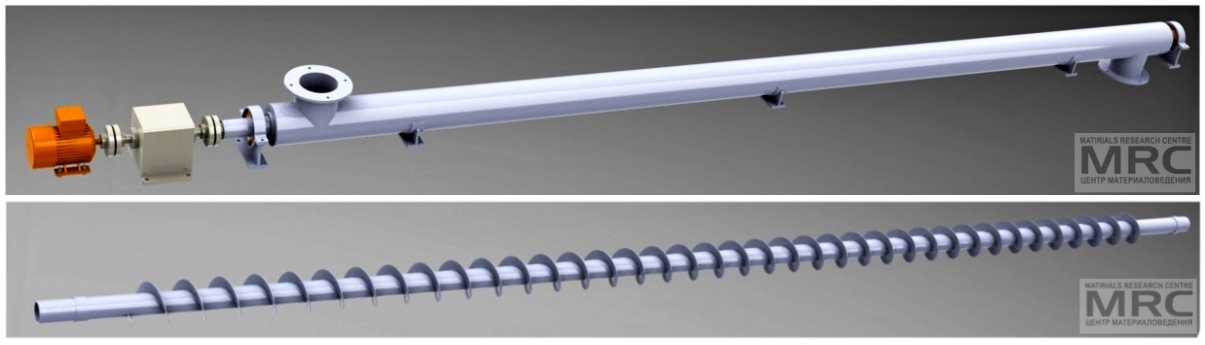 Действуют винтовые конвейеры с помощью осевой движущей силы. В неподвижном закрытом желобе вращается шнек винтового транспортера. Движение происходит за счет электрического двигателя с редуктором и двумя муфтами.