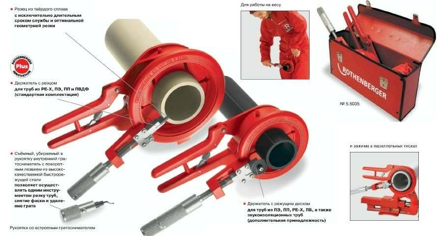 Труборез для пластиковых труб в базовой комплектации предполагает только само устройство. Но некоторые производители предлагают расширенную комплектацию — с дополнительными ножами, режущими дисками, держателями и вкладышами.