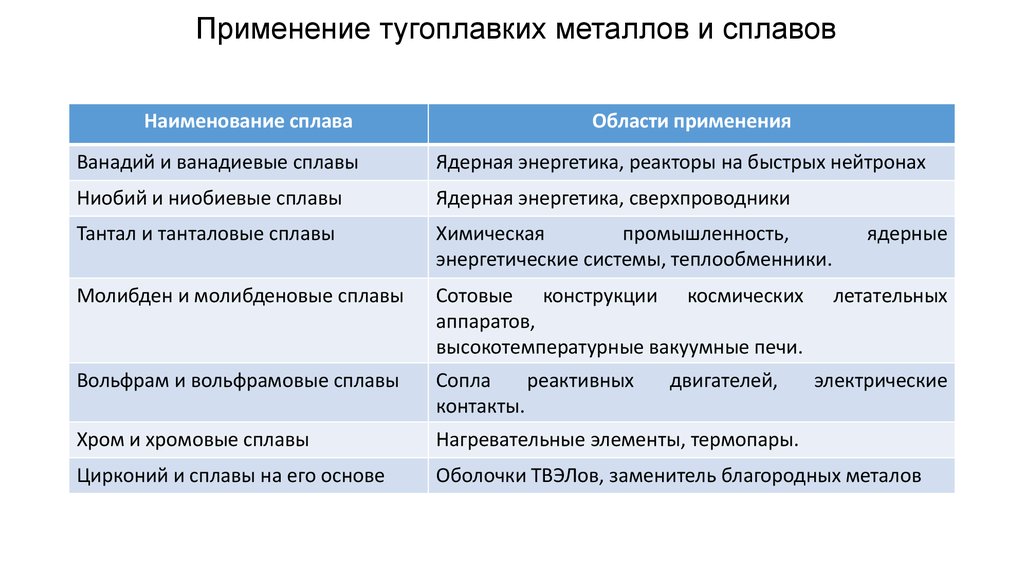 Применение тугоплавких металлов основано на максимально эффективном использовании их природных свойств. Среди отраслей народного хозяйства, прибегающих к помощи тугоплавких металлоэлементов, можно выделить строительство машин, судов, космических аппаратов и их деталей, атомную энергетику, ядерную промышленность и химическую промышленность, электроснабжение и металлургию. При этом практически нигде тугоплавкие металлоэлементы не используются “в живую”, обычно для этих целей берут их различные сплавы.