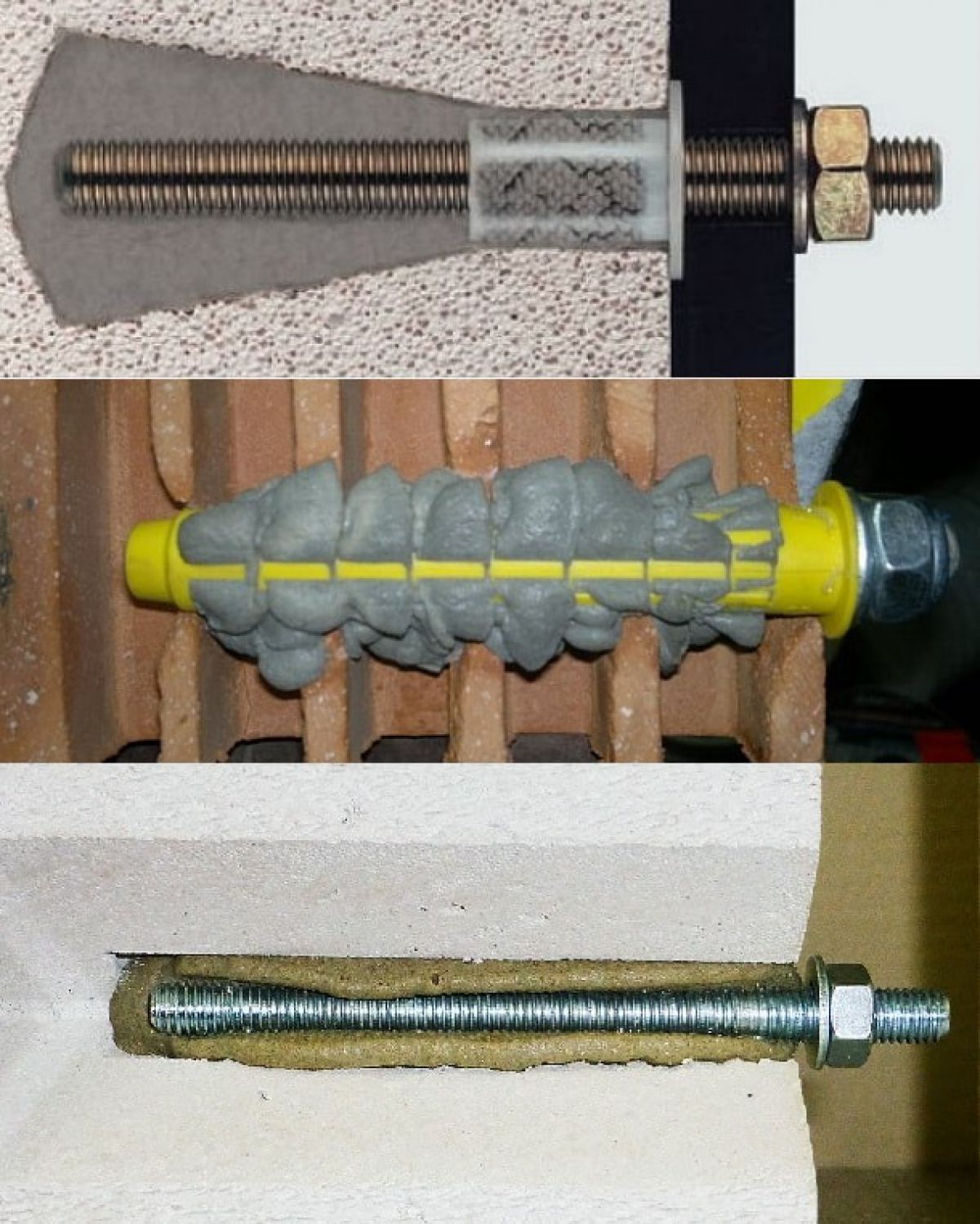 Крепления, основанные на заполнении внутренней части внедренного в стену стержня из металла, используются для обеспечения прочных соединений в камне, кирпиче, песчанике, ракушечнике, известняке, бетоне ячеистого типа. Такие соединения предусматривают использование химических анкеров, например популярного всесезонного типа момент крепеж cf900. Вставка из металла, представляющая собой стержень из арматуры, шпильку с резьбой или втулка, имеющая нарезку на внутренней поверхности, углубляется в подготовленное отверстие, диаметр которого превышает параметр анкера на 2 мм. После этого в гильзу вставляется капсула с клеем на основе полиэфирных, полиуретановых или акриловых смолистых веществ, отвердителя и наполнителя в виде песка. Затем выполняют разрушение стеклянного цилиндра и выполняют введение в него металлического стержня и ожидают схватывания связующего вещества.