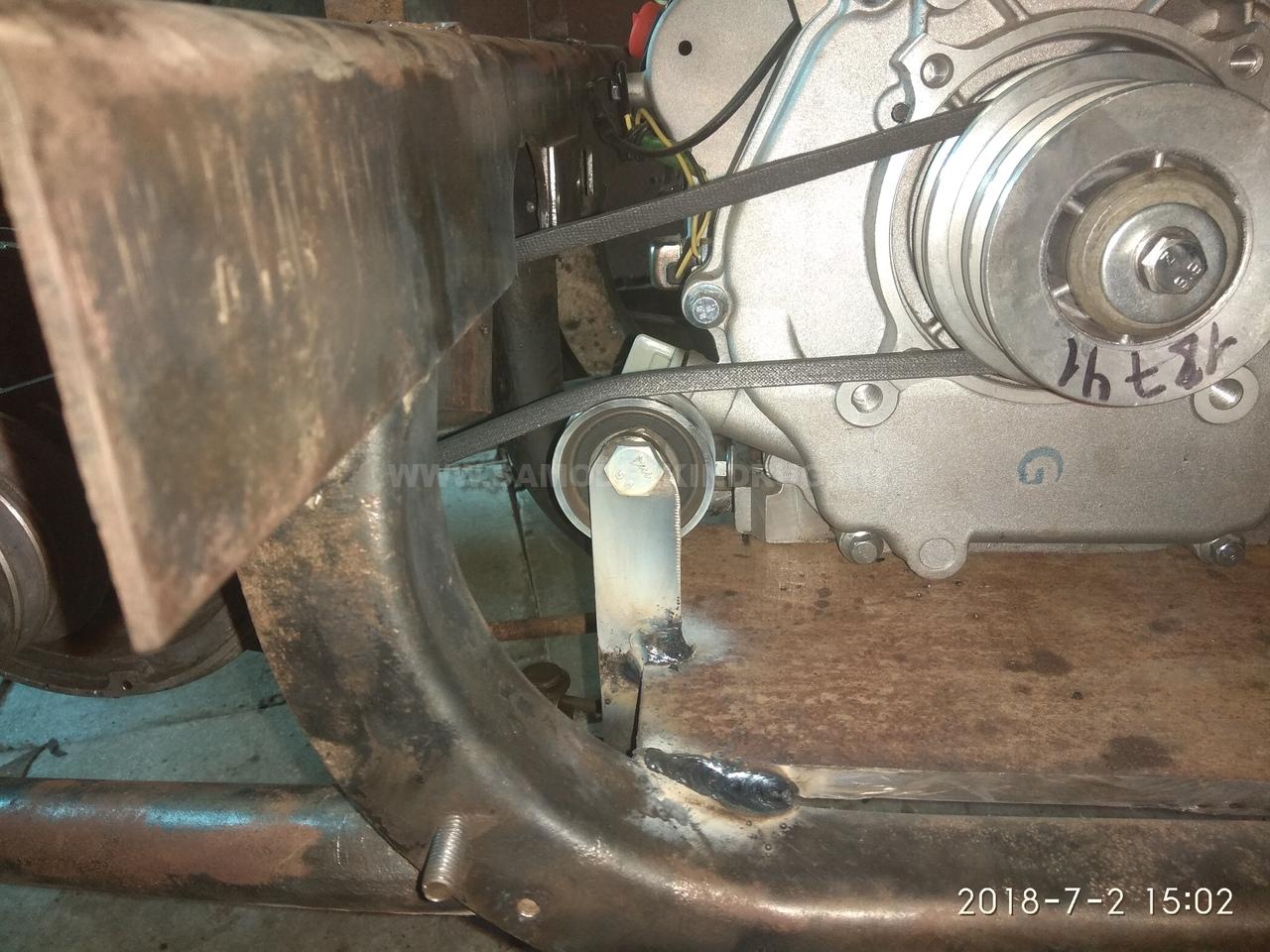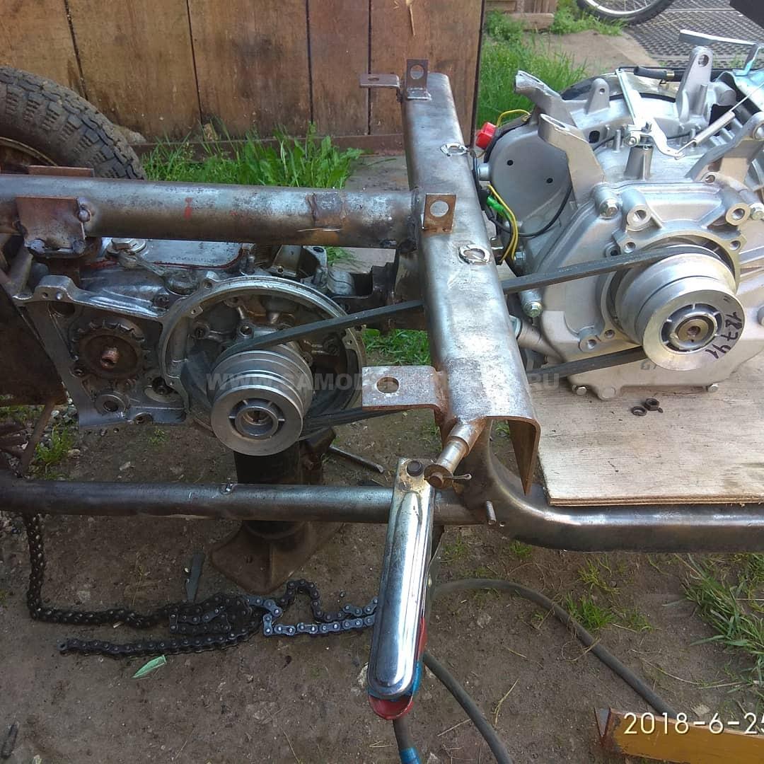 - Мотор соединяется с ходовой частью транспортного средства с помощью ремня или цепи. Закрепляются тросы переключения передач, рычаги управления.