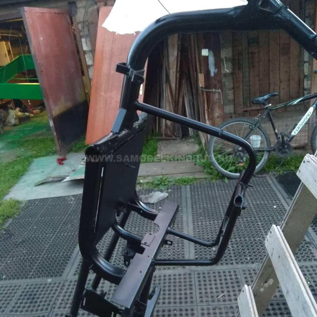 При конструировании съемного кузов, потребуется и крепление бака, номера, поворотников непосредственно к раме (не путать с кузовом). Нужно добиться, чтобы центр тяжести был около осей петель (около 30 см по отношению к заднему краю). Только так кузов будет без проблем опрокидываться вручную.