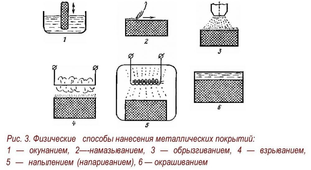 | Распыление (пульверизация) электродуговым, газопламенным методомАлюминий, серебро, медь, золото, бронза, латунь, сталь | Окунание в расплавленный металлЦинк, свинец и прочие | |