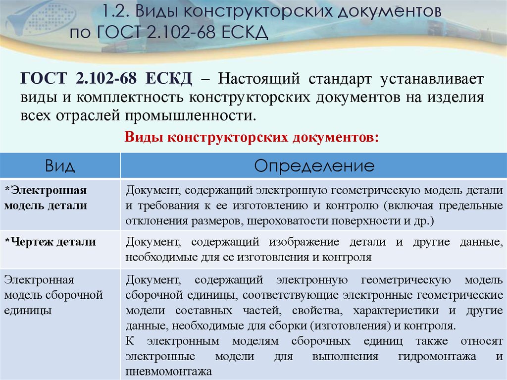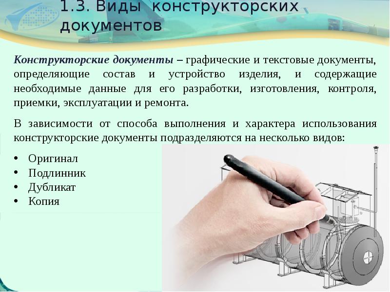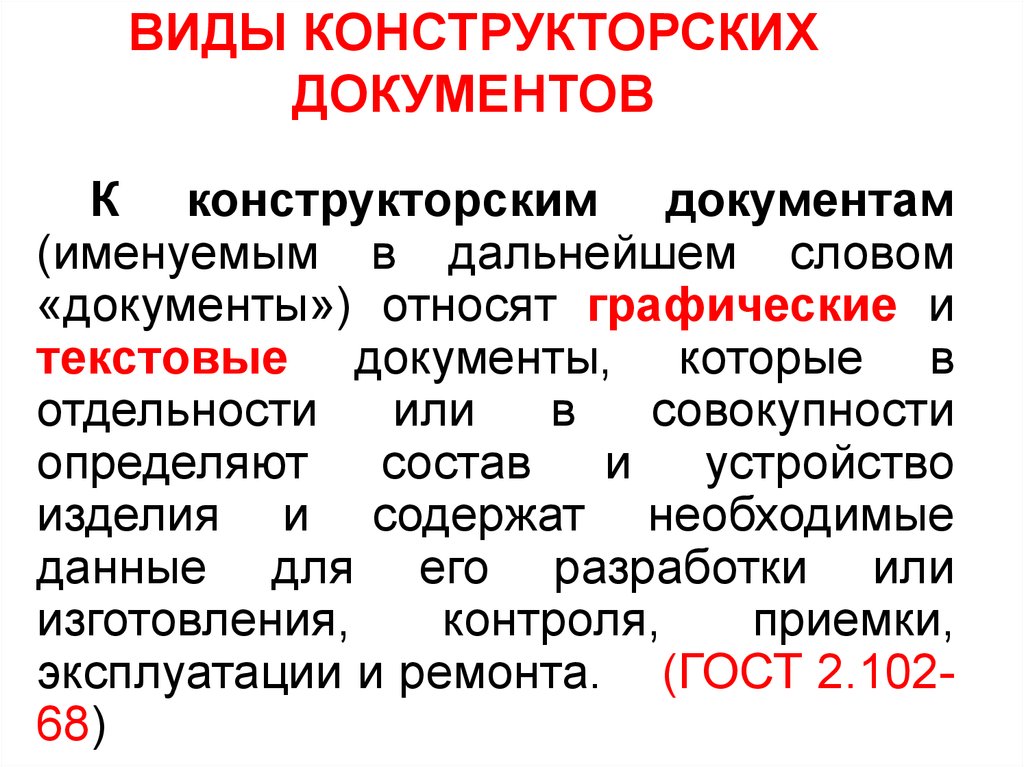 3.1.2 К конструкторским документам относятся графические, текстовые, аудиовизуальные (мультимедийные) и иные документы, установленные стандартами ЕСКД, содержащие информацию об изделии, необходимую для его проектирования, разработки, изготовления, контроля, приемки, эксплуатации, ремонта (модернизации) и утилизации.