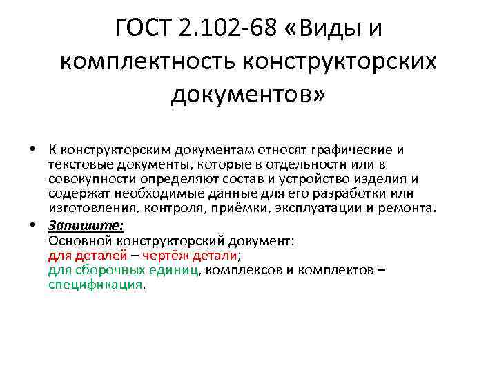 В состав комплекта КД на изделие или его составную часть обязательно входит основной конструкторский документ, который полностью и однозначно определяет данное изделие и его состав. За основные конструкторские документы принимают: для деталей — чертеж детали; для сборочных единиц, комплексов и комплектов — спецификацию.