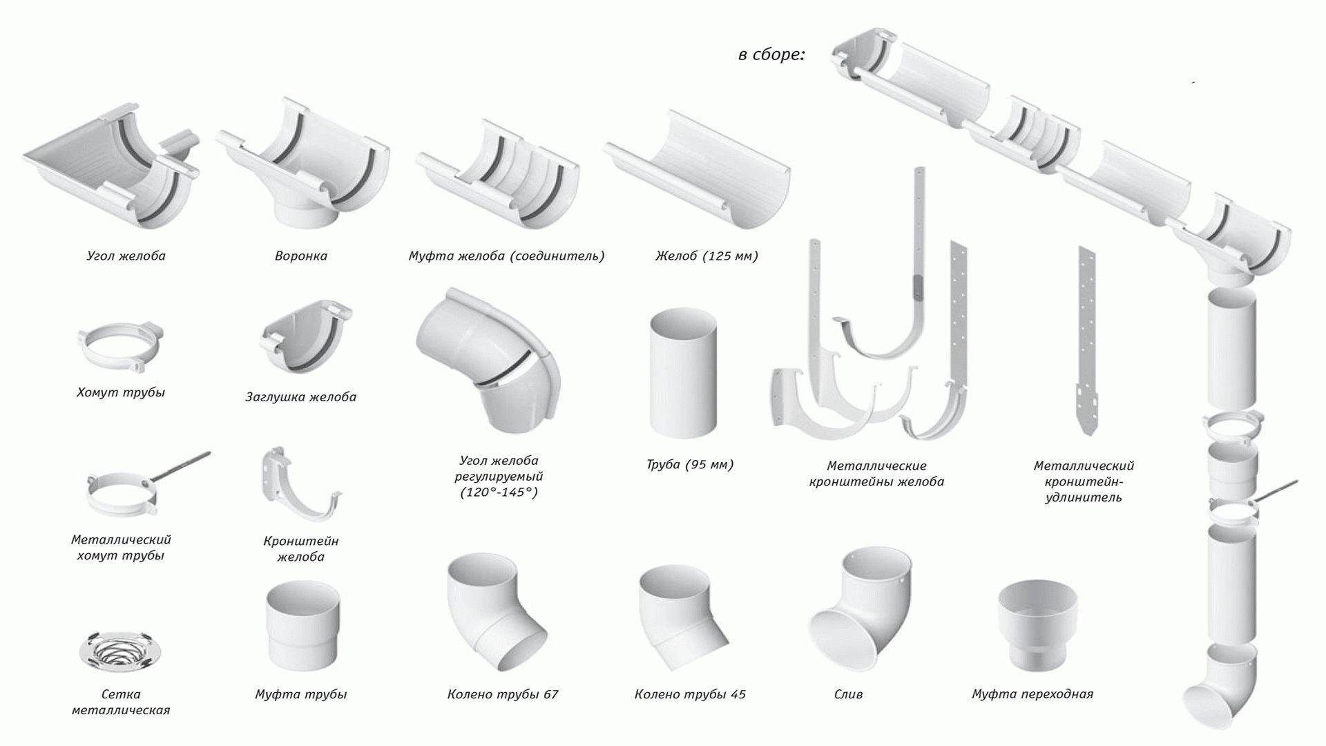 Перед монтажом водостока требуется изучить все составляющие элементы, которые потребуются в работе, а именно: