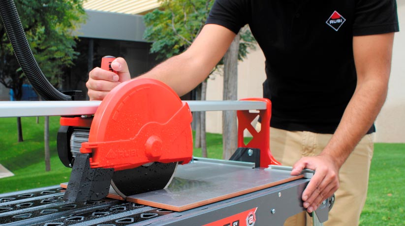 Водяное охлаждение, высокая мощность, 20-сантиметровый диск… Всё это есть в модели. Особенностью является верхнее расположение двигателя, при котором режущий блок перемещается по направляющей и разрезает разные виды керамических плиток. Пильный диск закрывается кожухом для исключения травмирующих ситуаций, защиты от пыли, искр, осколков.