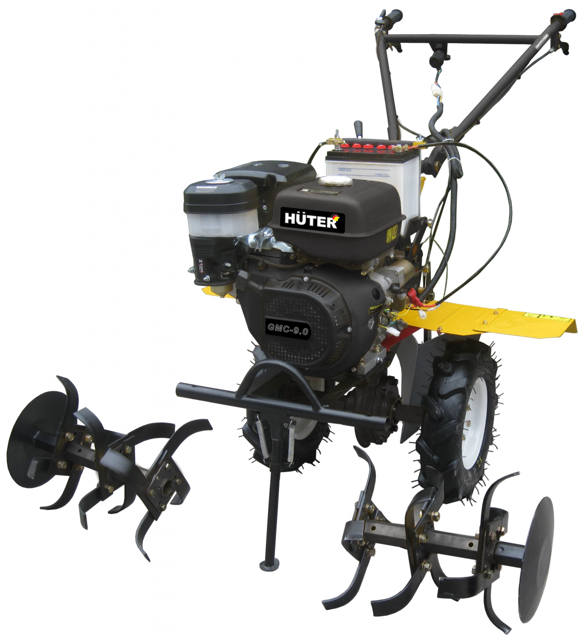Неоднократно задумываясь, какой мотоблок лучше купить для деревни выбирают модели из линейки Хутер и понятно почему. Это качественные и в свою очередь недорогие агрегаты, зарекомендовавшие себя с положительной стороны. Эта машина многофункциональна благодаря наличию ВОМ, так она сможет делать по 5 дел, если переставлять навесное оборудование. Вдобавок ко всему Huter MK-9500 GMC-9.0 обладает мощным двигателем, который тянет даже целину. На пневмоколесах создан агрессивный, можно сказать даже экстремальный, рисунок. Еще мотоблок способен конкурировать со многими по ширине захвата, она у него больше метра.