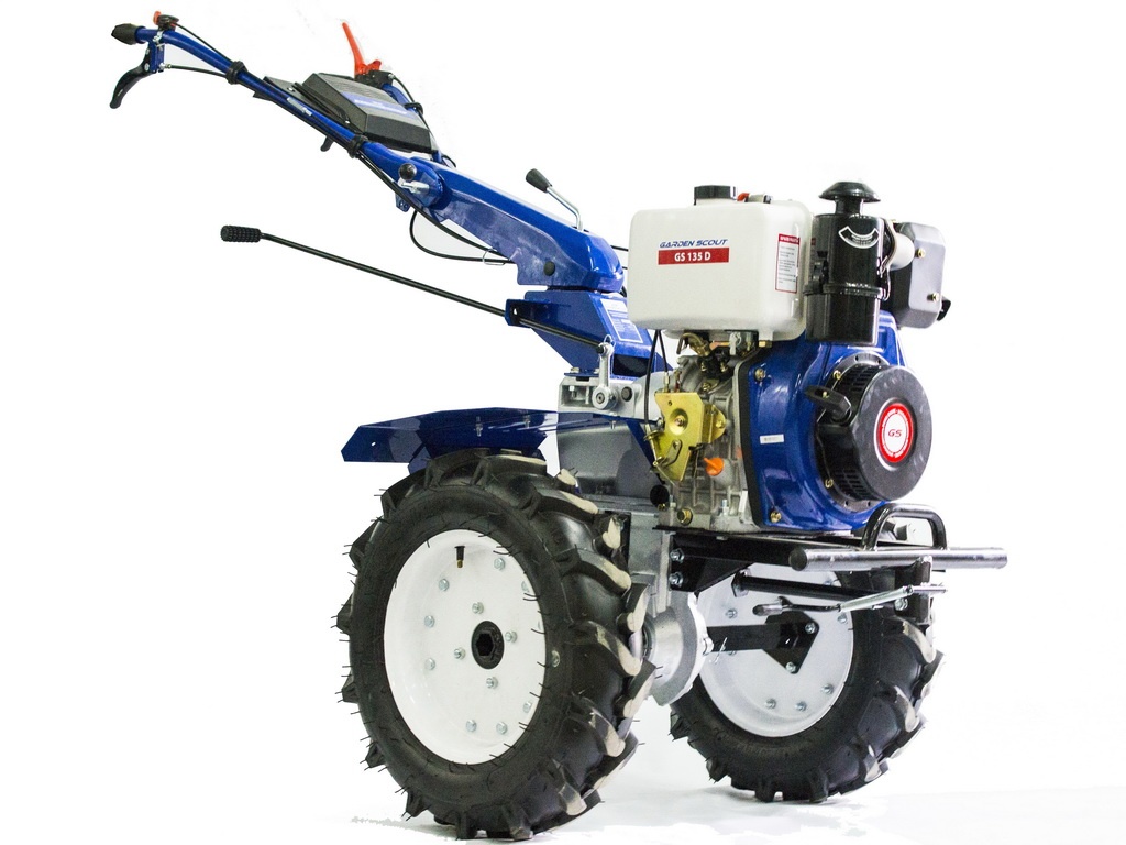 Для оснащения мотоблока с валом отбора мощности Скаут 135 DE использован четырёхтактный дизельный двигатель на 9 л.с. с топливным баком на 5,5 л. В его комплектацию входят 10 культивационных фрез, обеспечивающих ширину захвата от 75 до 135 см и глубину вспахивания – от 8 до 30 см. Данный агрегат очень мощный и предназначен для обработки больших площадей. Он имеет высокую проходимость даже в условиях неровного рельефа, где обычной мототехнике трудно произвести качественное рыхление почвы. Вес его составляет 142 кг, а цена стартует от 52900 рублей.