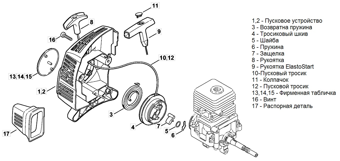 - Магнето: устройство, преобразующее механическую энергию в электрическую, обеспечивает импульс тока к свече зажигания бензопилы;