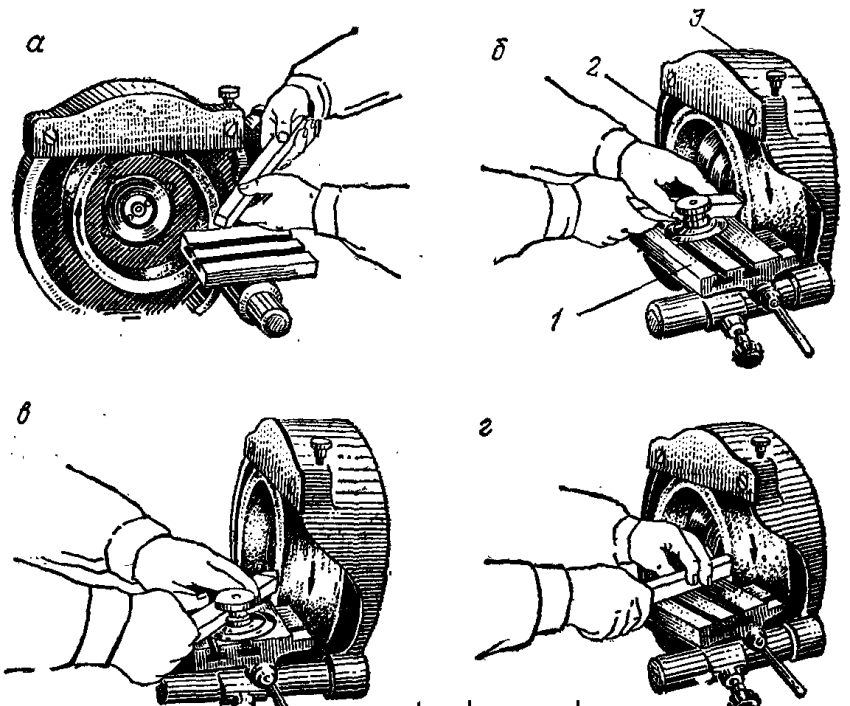 Заточка поверхностей резца: а) передней поверхности; б) главной задней поверхности; в) вспомогательной задней поверхности; г) радиуса закругления вершины