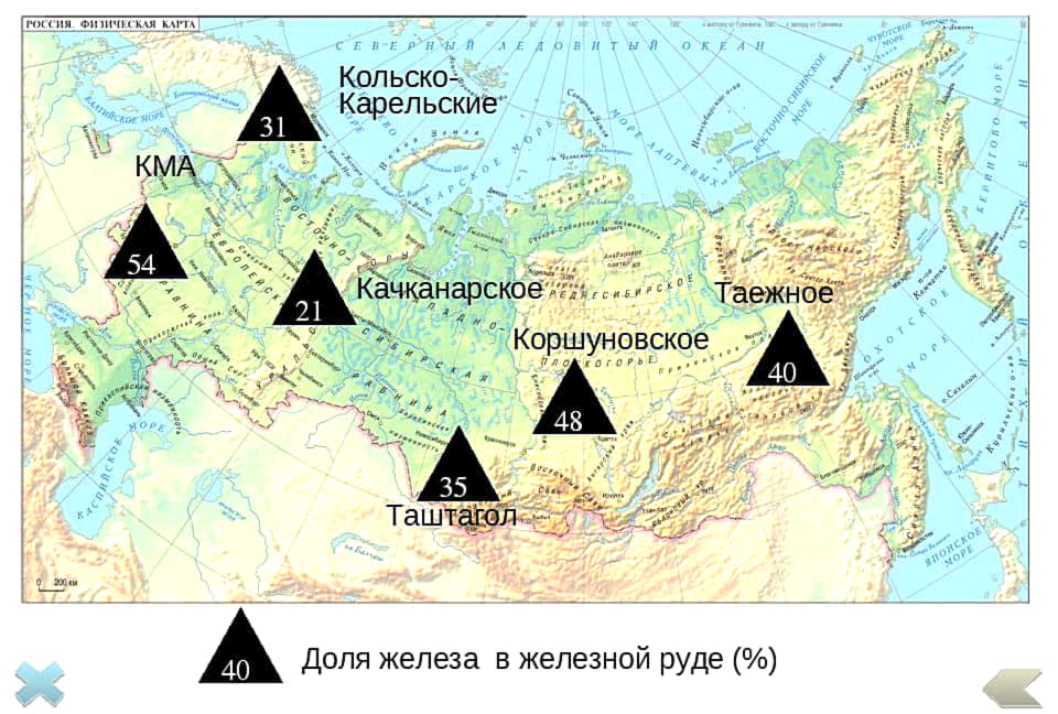Железорудные ресурсы России представлены в виде красного и бурого железняка. Месторождения расположены неравномерно по всей стране, и основная их часть приходится на европейскую территорию. В частности, там находится курская магнитная аномалия, располагающая 25%-ыми запасами железной руды всего мира. Она включает в себя 150 кв. километров площади и охватывает территорию девяти губерний. По оценкам зарубежных экспертов запасы ее руды равны около 200 млрд. тонн. Из них на обогащенную руду приходится 30 млрд. тонн.